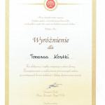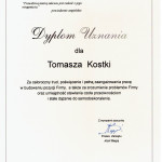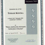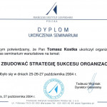 - Certyfikat coacha biznesu Szkoły Coachingu Relacyjnego Transmisja – 2004