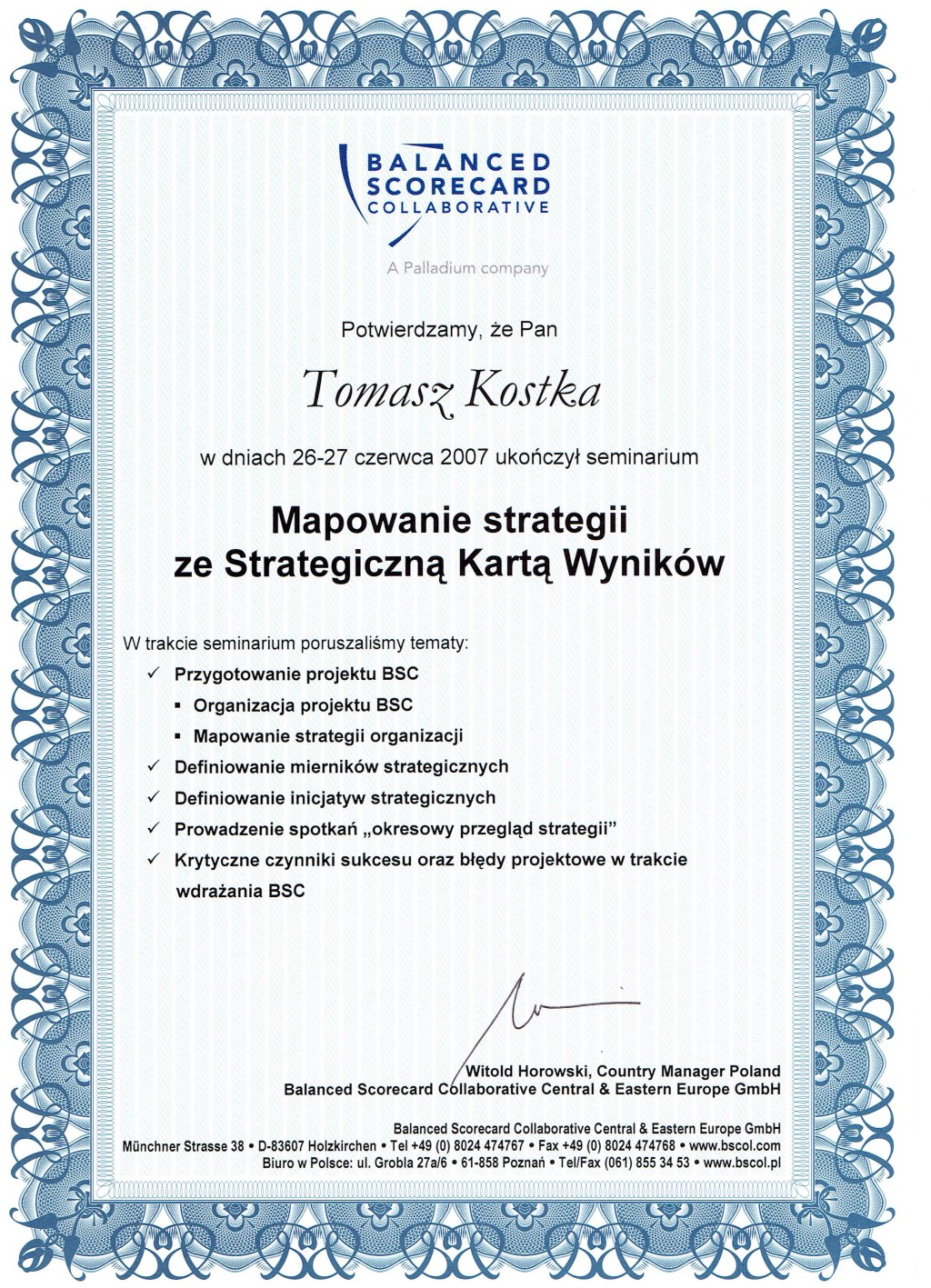 Ekspert w dziedzinie tworzenia i wdrażania strategii przy wykorzystaniu Strategicznej Karty Wyników (BSC) – do chwili obecnej zrealizował ponad 200 projektów w tym zakresie z różnych branż – usługi (m.in. Grupa Impel, Polski Związek Motorowy, MPK Częstochowa), produkcja (m.in Wago Elwag, Mamut, Pafal – Grupa Apator, Cast), finanse (m.in. Europejski Fundusz Leasingowy), energetyka (m.in Grupa Elektrotim, Sonel), dystrybucja (m.in. Etoll, Ice-Full), farmacja (m.in PGF Urtica, Hasco, Dolnośląska Grupa Apteczna), budownictwo (m.in. Vantage Development, Ziajka), IT (m.in. Grupa AB, Impel IT, Iteger), rolnictwo (m.in. John Deere Polska, KWS).