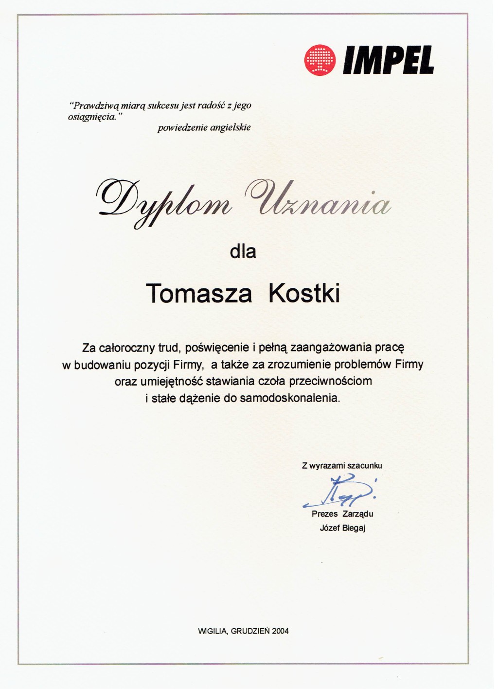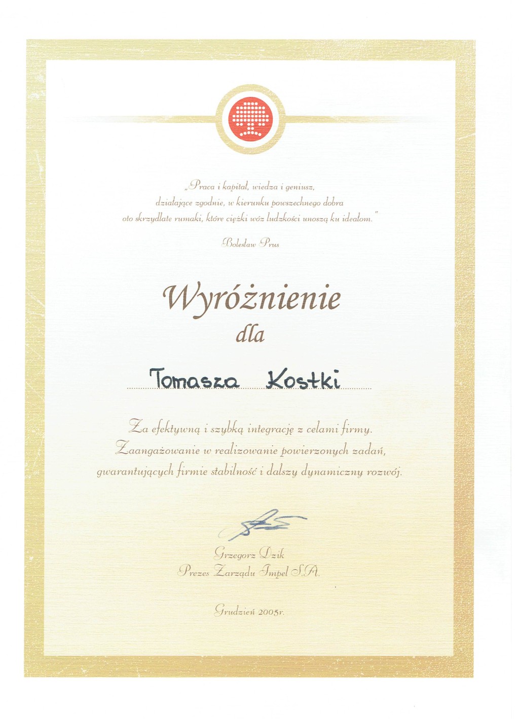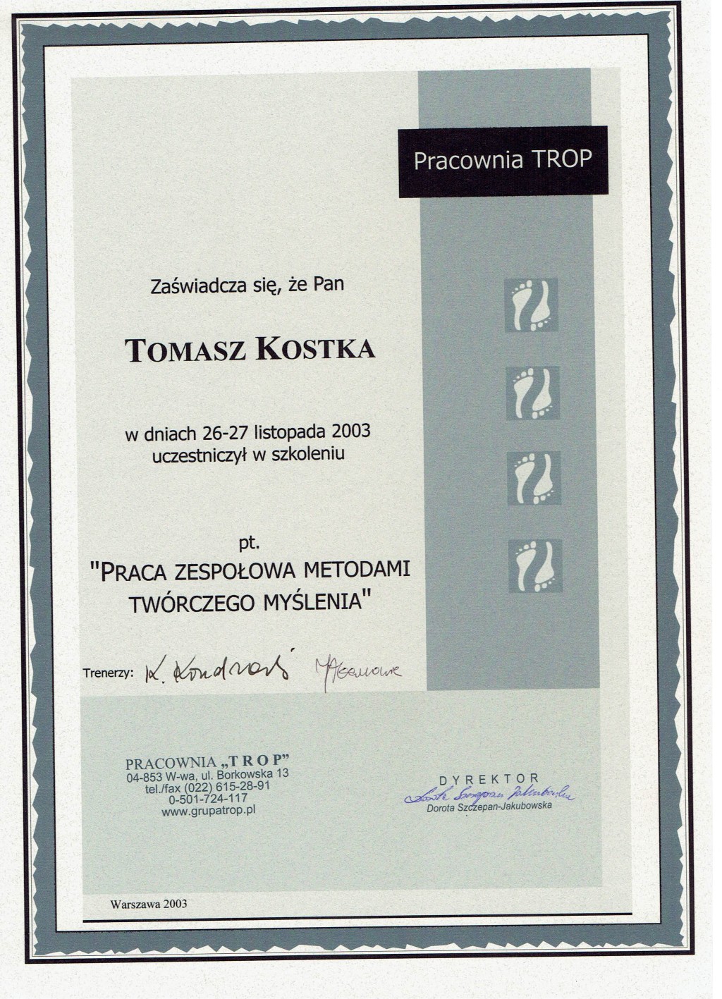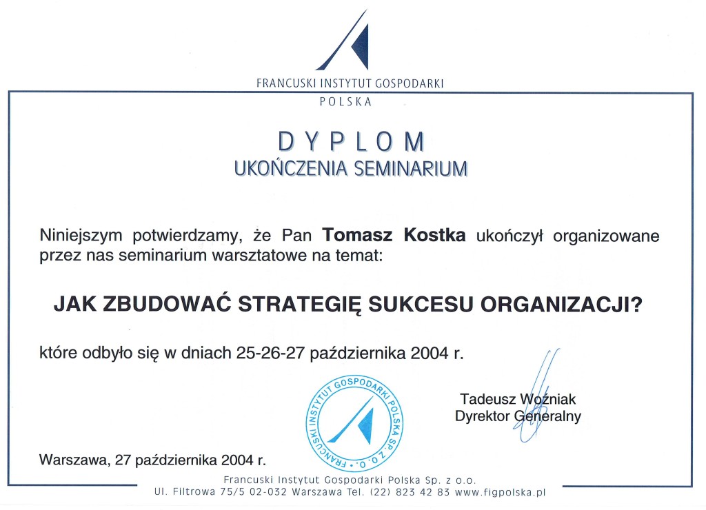- Certyfikat coacha biznesu Szkoły Coachingu Relacyjnego Transmisja – 2004