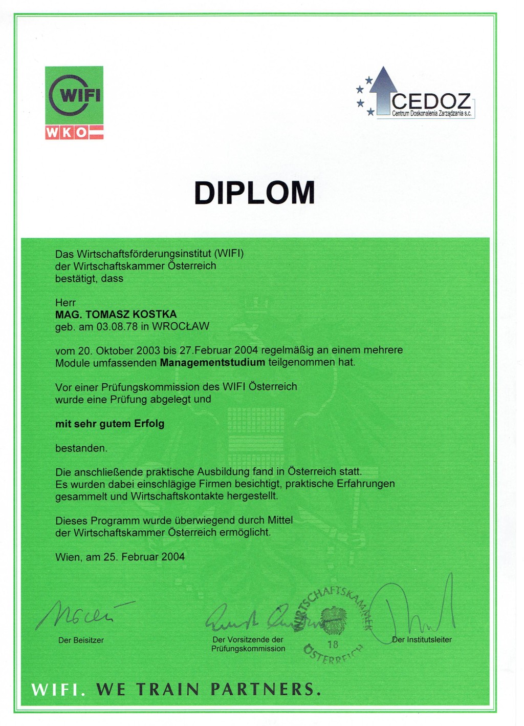 - Dyplom ARG Poznań, Podyplomowe Studia Zarządzania Zasobami Ludzkimi – 1998-1999